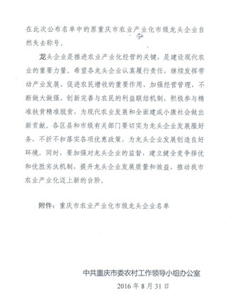 根據(jù)《重慶市農(nóng)業(yè)產(chǎn)業(yè)化市級(jí)龍頭企業(yè)申報(bào)認(rèn)定與監(jiān)測(cè)管理辦法(試行) 》(渝委農(nóng)工組辦〔2011〕7號(hào))規(guī)定,市農(nóng)委組織開展了2016年農(nóng)業(yè)產(chǎn)業(yè)化市級(jí)龍頭企業(yè)申報(bào)及監(jiān)測(cè)工作。在區(qū)縣和市級(jí)有關(guān)部門審核上報(bào)、有資質(zhì)中介機(jī)構(gòu)評(píng)審基礎(chǔ)上,經(jīng)研究并向社會(huì)公示,決定認(rèn)定重慶六九畜牧科技股份有限公司為重慶市農(nóng)業(yè)產(chǎn)業(yè)化市級(jí)龍頭企業(yè)。