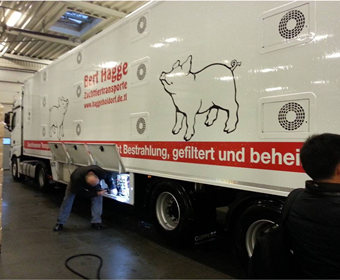 16日,考察團(tuán)經(jīng)德國邊境,進(jìn)入丹麥,考察了位于丹麥邊境上的大型卡車自動清洗站。官方人員現(xiàn)場檢查、清洗進(jìn)入國境內(nèi)的運豬車,采取嚴(yán)格消毒準(zhǔn)入制度。這種嚴(yán)格的生物安全處理措施非常值得國內(nèi)同行借鑒學(xué)習(xí)。