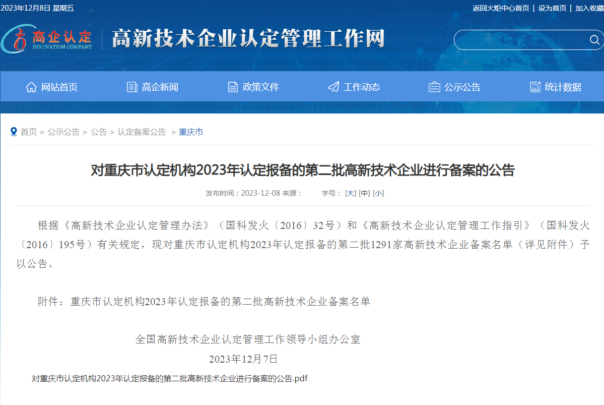 2023年12月7日,全國高新技術企業(yè)認定管理工作領導小組辦公室公告:重慶市六九畜牧科技股份有限公司通過2023年第二批高新技術企業(yè)復審。