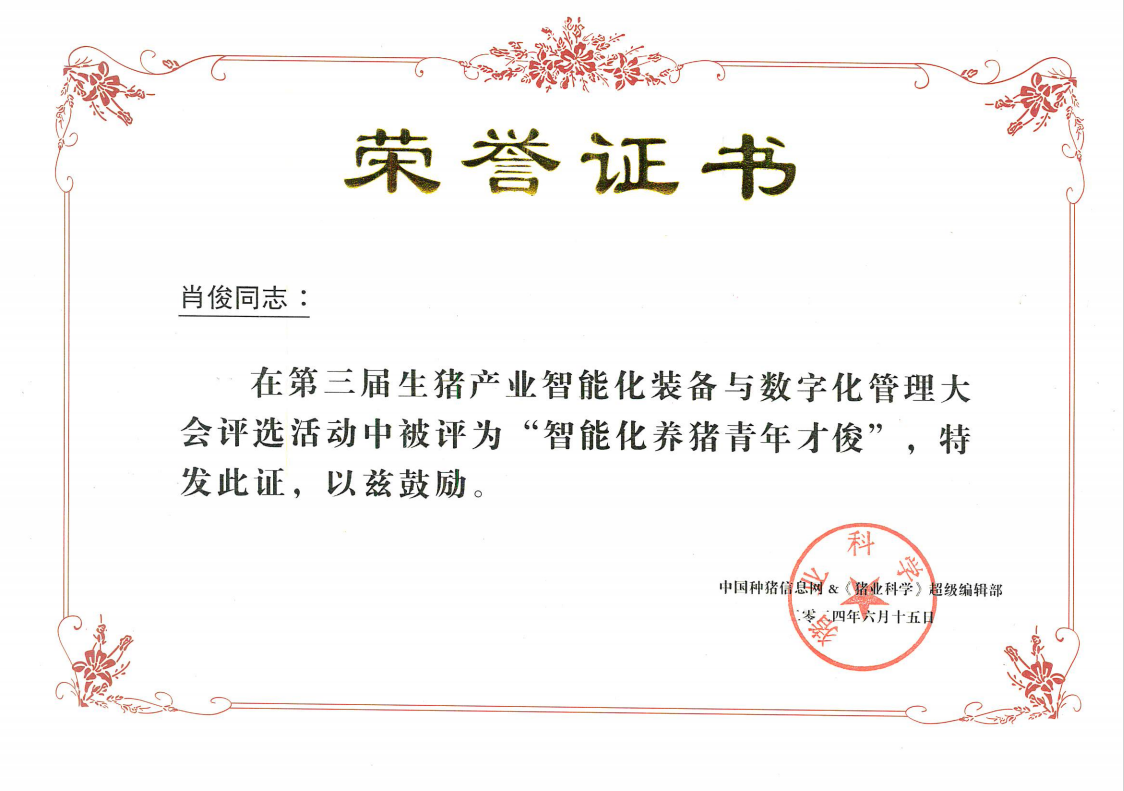6月15日,由中國(guó)種豬信息網(wǎng)&《豬業(yè)科學(xué)》超級(jí)編輯部、中國(guó)畜牧獸醫(yī)學(xué)會(huì)信息技術(shù)分會(huì)主辦的第三屆生豬產(chǎn)業(yè)智能化裝備與數(shù)字化管理大會(huì)在河南南陽(yáng)召開(kāi)。69畜牧應(yīng)邀參會(huì)并參與中國(guó)生豬產(chǎn)業(yè)智能化與數(shù)字化管理的學(xué)習(xí)和交流。會(huì)上,69畜牧獲評(píng)“智能化養(yǎng)豬創(chuàng)新團(tuán)隊(duì)獎(jiǎng)”,公司發(fā)展部副部長(zhǎng)肖俊獲評(píng)“智能化養(yǎng)豬青年才俊”榮譽(yù)稱號(hào)。